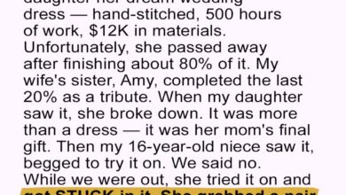 My late wife spent 500 hours hand-sewing my daughter’s wedding dress, her final act of love before passing. It cost…