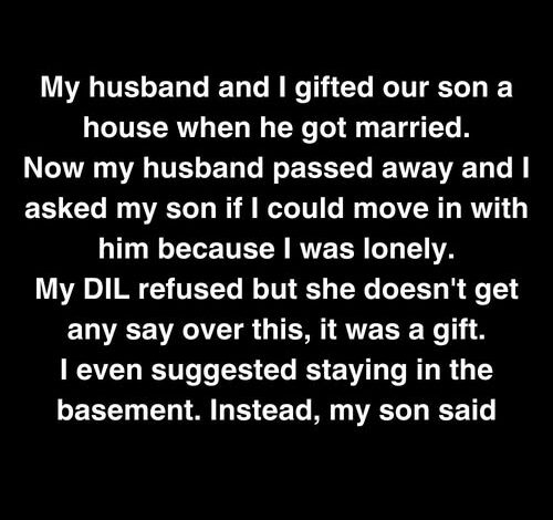 My husband and I gifted our son, Idir, a house when he married Paola. After my husband’s sudden death, I asked to move into their basement, feeling lonely. Paola refused, and Idir suggested a senior community, which hurt deeply. The house, filled with memories of our early marriage, was a gift, but I still held partial ownership for tax reasons.