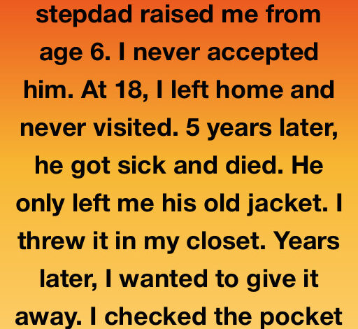My stepdad raised me from age 6 after my real dad left. I never accepted him, leaving home at 18 without looking back. Years later, he died, leaving me his old jacket. I tossed it in my closet, intending to give it away. Checking the pockets, I found a letter in his uneven handwriting.