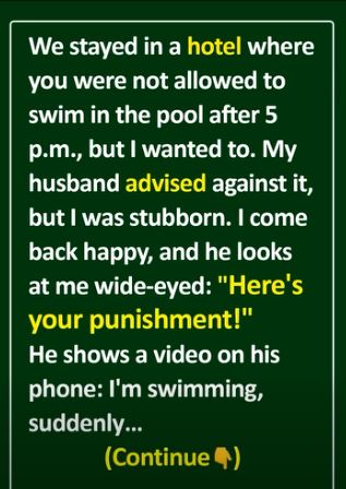 We stayed in a hotel where you were not allowed to swim in the pool after 5 p.m., but I wanted to. My husband advised against it, but I was stubborn. I come back happy, and he looks at me wide-eyed. He laughs: “Here’s your punishment!” He shows a video on his phone: I’m swimming, and suddenly a cat comes to the edge of the pool and does its little business. My husband kept teasing me for the rest of the vacation, and I believed in instant karma.