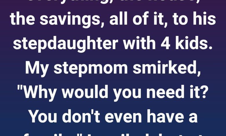Dad’s leaving his entire estate and our childhood home to his stepdaughter (whom he raised since her teens), who has four kids. My stepmom justified it cruelly: “It’s not like you have children to raise!” I stayed silent—until after dinner.
