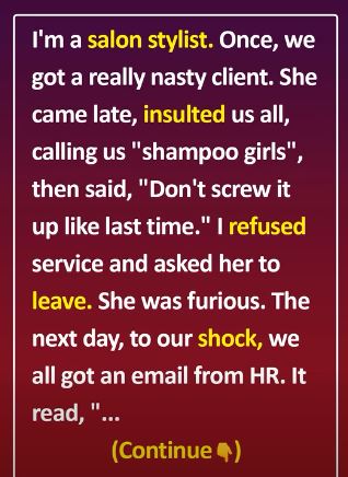 The justification? According to HR, the salon’s reputation depends on “consistently polite service” and “maintaining the loyalty of high-value clients.” They even added that we should “adjust our tone and expectations” to suit any client’s mood because this is how the salon stays afloat and attracts people with money.