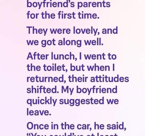 The day unfolded smoothly: warm welcomes, easy chatter, and a cozy shared lunch. I even thought, *This is going too well.* Then, after a quick bathroom break, the vibe flipped. Smiles faded; my boyfriend’s dad stared at his plate, his mom forced a tight grin. My boyfriend whisked us out with a mumbled farewell.