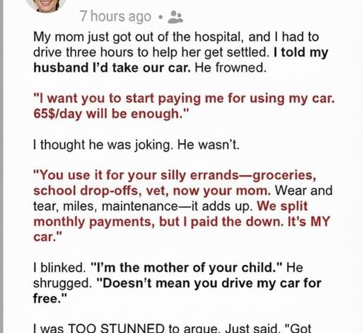My mom had a stroke. I planned three days to help her settle at home and asked my husband Liam if I could use our shared car. He didn’t look up from his phone: “Sure—$65 a day.”