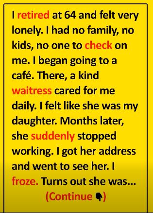 I retired at 64 and felt very lonely. I had no family, no kids, no one to check on me. I began going to a café. There, a kind waitress cared for me daily. I felt like she was my daughter. Months later, she suddenly stopped working. I got her address and went to see her. I froze. Turns out she was…