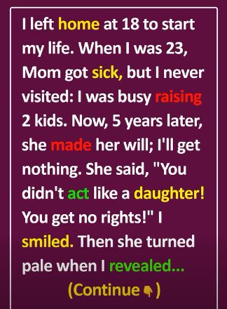 When I was 23, Mom got sick, but I never visited: I was busy raising 2 kids and facing my own struggles. Now, 5 years later, she made her will; I’ll get nothing. No house, no savings, not even a keepsake.