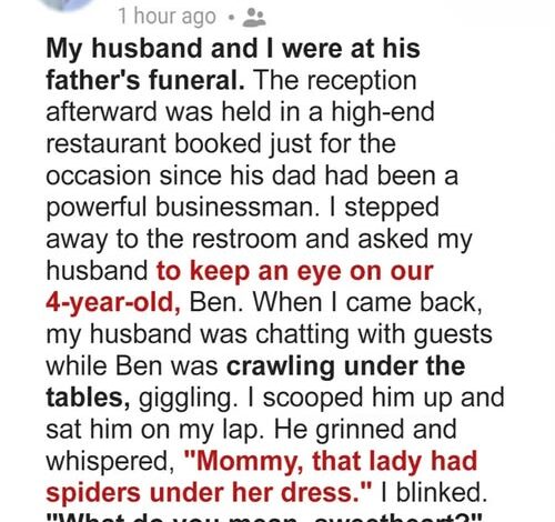 Grief cloaked the reception hall. While I spoke in murmurs, Ben crawled beneath tables, giggling. When I found him, his face was serious. He tugged my dress and whispered, “Mommy, I saw Daddy touch another lady’s leg.”