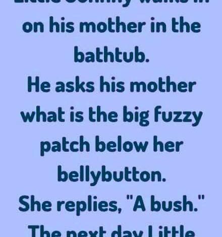“Mom,” he asked innocently, “what’s that fuzzy patch below your belly button?” Caught off guard but staying calm, she gently replied, “That’s called a bush, sweetheart.”