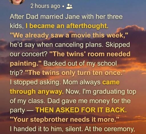 Now I’m graduating top of my class. Dad gave me money for my graduation party—then asked for it back because my stepbrother “needed it more.” I handed it over without arguing. I was done fighting for space in his life.