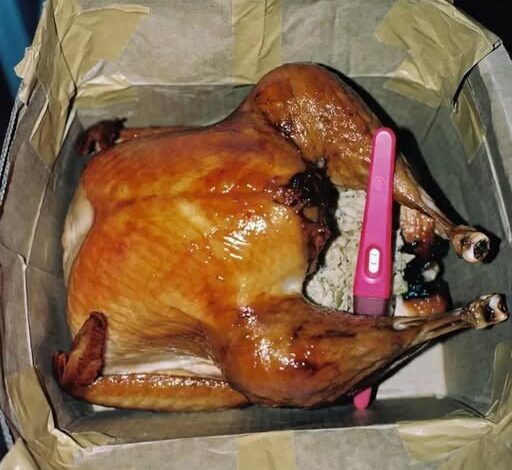 Inside: a perfectly cooked turkey, a positive pregnancy test… and a USB drive. On top was a handwritten note: