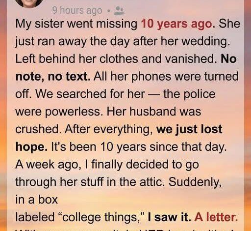 My sister disappeared ten years ago—one day after her wedding. She left behind her clothes, her phone, her entire life. No note. No message. We searched everywhere. The police found nothing. Eventually, hope faded.