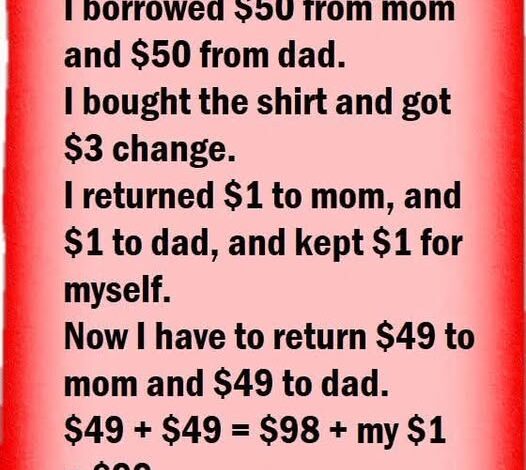 Now, the puzzle says $49 + $49 = $98, and then adds that $1 you kept, bringing the total to $99. Hold up! You’re wondering: where’s that last dollar?
