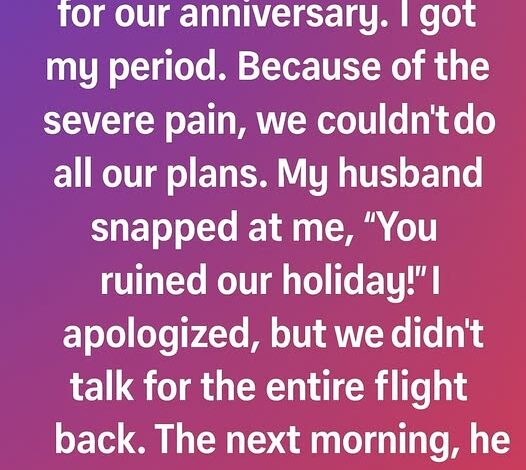 We were celebrating our anniversary at a luxury resort when it happened—I got my period. The pain was intense, enough to cancel our plans. Instead of concern, my husband snapped, “You ruined our holiday.” I apologized through tears. He didn’t speak to me for the rest of the trip. On the flight home, he sat in silence. I stared out the window and felt something finally settle.