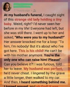 The cemetery was quiet in the late afternoon, long after the funeral had ended. I lingered, trying to understand a future that no longer included my husband. As I turned to leave, I noticed an elderly woman standing a few rows away, holding a baby wrapped in a pale blanket. I didn’t recognize her, yet she hadn’t left like everyone else. She stood there calmly, as if waiting.
