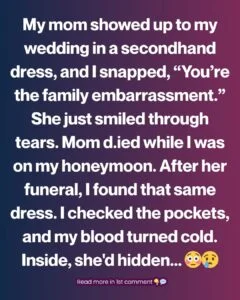My mom showed up to my wedding in a secondhand pale blue dress, slightly outdated and loose. Her hair was pinned back, hands folded nervously, as if she already knew the whispers would come. And they did—my bridesmaids murmured, “Is that really what your mom is wearing?”