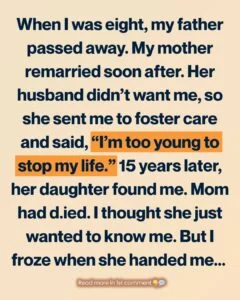 She handed me a letter from our mother. It confessed her mistakes, begged forgiveness, and urged me to be there for my sister, now fourteen, before it was too late.