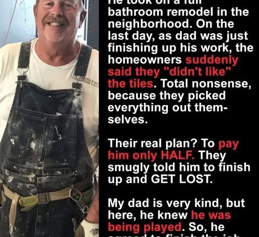 My dad’s a plumber, and for years he’s been known as the kind, honest guy who never cuts corners. One day, he finished a full bathroom remodel for neighbors who had personally chosen every tile and fixture. On the final day, they suddenly claimed they “didn’t like the tiles” and announced they’d only pay him half. The excuse was nonsense—they just wanted to cheat him.