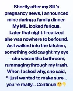 Later, I realized she was missing and found her in the bathroom—going through my trash. Confused, I asked what she was doing. She said she wanted to make sure I was really pregnant, implying I might be faking it for attention. I was shocked. My privacy had been violated, and I couldn’t believe she actually doubted me.
