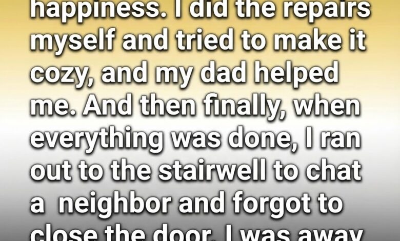 My parents gave me a small one-bedroom apartment, and I cried with happiness. I did most of the repairs myself, with my dad’s help, trying to make it feel like home. When everything was finally finished, I stepped into the stairwell to chat with a neighbor and forgot to close the door. I was gone less than five minutes. When I came back, my heart dropped.
