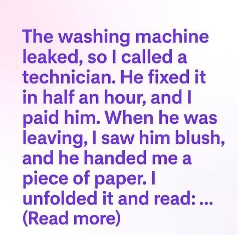 The washing machine leaked, so I called a technician. He fixed it in half an hour and, as he was leaving, handed me a folded note, blushing.