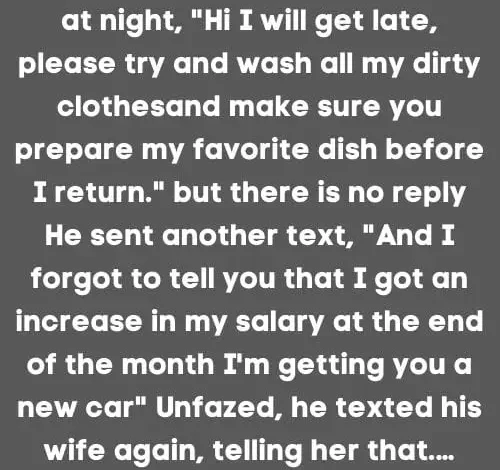 One evening, a husband texted his wife asking her to cook his favorite meal and wash his dirty clothes before he got home. When she didn’t reply, he sent another message saying his salary had increased and he was buying her a new car.