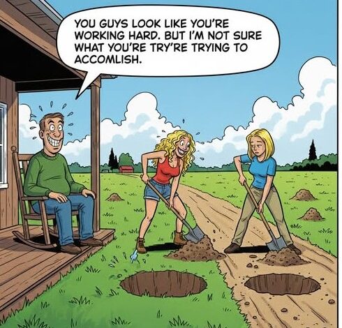 A man is sitting on his porch when he notices two blondes working down the road. They both have shovels. One of the blondes digs a hole, and the other immediately fills it in.