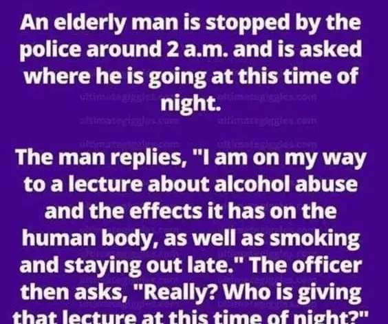 The man replies, “I am on my way to a lecture about alcohol abuse and the effects it has on the human body, as well as smoking and staying out late.”