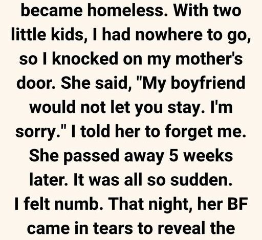 At 24, I lost my job and became homeless. With two small children and nowhere to go, I swallowed my pride and knocked on my mother’s door. She looked thinner than I remembered—tired, but still gentle.