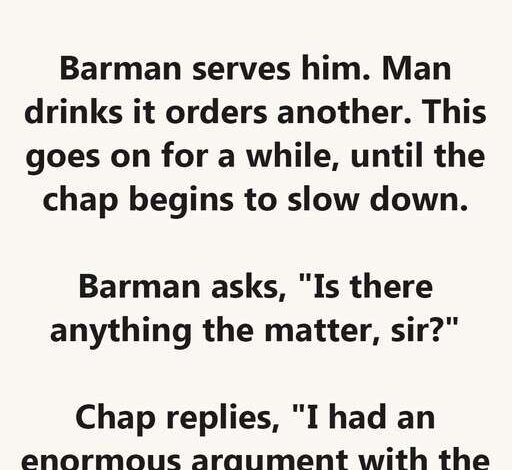 A man walks into a bar and orders drink after drink. When the bartender asks what’s wrong, he says, “I had a huge fight with my wife. She won’t speak to me for a month.”