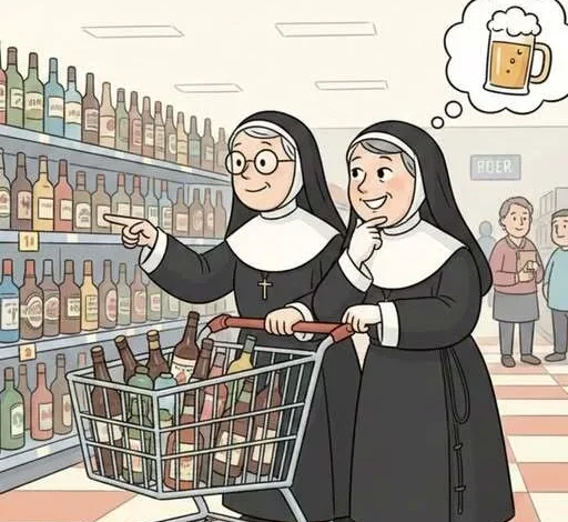The first nun said that she would handle it and picked up a six pack and took it to the cashier. The cashier had a surprised look and the first nun said, “This is for washing our hair.”