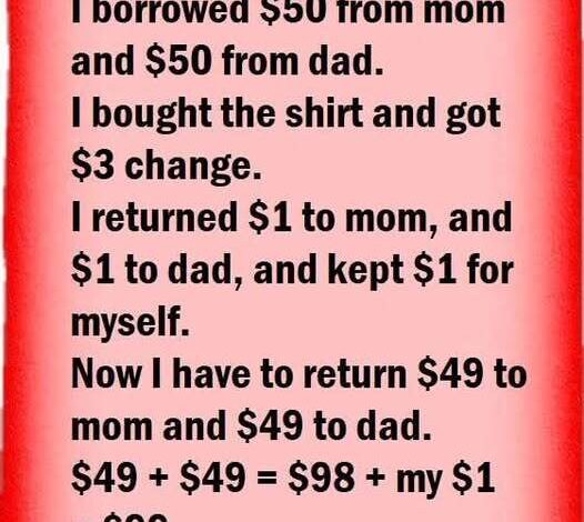 You find a shirt for $97 and borrow $50 from Mom and $50 from Dad, giving you $100. After buying the shirt, you get $3 back. You return $1 to Mom, $1 to Dad, and keep $1.