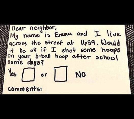 A young girl, eager to practice basketball, heard the thwack of a ball from her neighbor’s driveway. Wanting to use their hoop, she knocked on their door but got no answer. Undeterred, she wrote a heartfelt note asking permission, slipped it into their mailbox, and anxiously awaited a reply. When she checked, her neighbors had