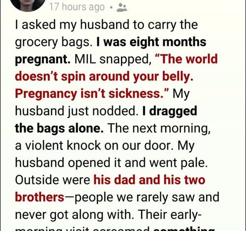 I was eight months pregnant when I asked my husband to help carry the groceries upstairs. It wasn’t an argument—just a tired request. My back ached, my feet were swollen, and every step felt heavy.