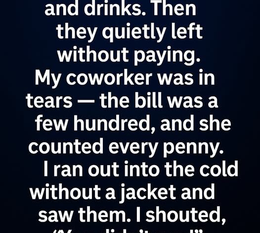 Her pain hit me hard. Without thinking, I ran into the freezing night, no jacket, breath clouding in the air. Spotting them down the street, I shouted, “You didn’t pay!” They turned, startled. One sighed, approaching me. “We weren’t stealing,” he said softly. “We’re both jobless, just trying to forget our troubles. We couldn’t face the bill.”