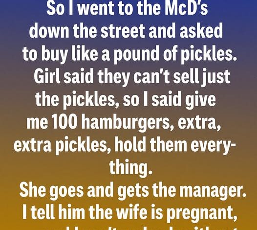 Determined to bring a smile to my wife’s face, I jokingly said, “Okay then, give me 100 hamburgers with extra pickles, and hold everything else.” The cashier looked puzzled and went to get the manager.When the manager arrived, I explained the situation: “My wife is pregnant, and she’s been craving McDonald’s pickles. I really don’t want to go home without them.”