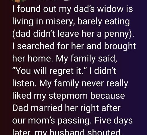 Months later, I found my stepmother—whom my family had always quietly resented—living in near poverty. My father hadn’t left her anything. She was alone in a cramped apartment with barely enough food to get by.