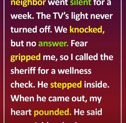 My oxygen-dependent neighbor went quiet for days. The TV glow stayed on, but no one answered the door. A heavy feeling settled in my chest, so I called the sheriff for a wellness check.