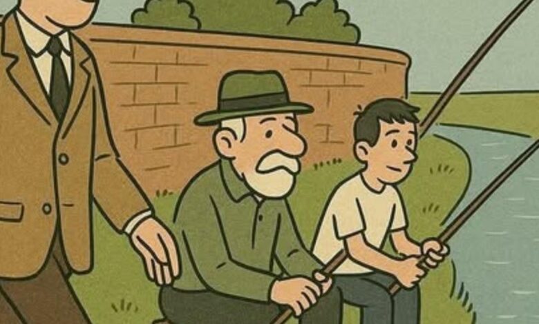 A gentleman strolling alongside a canal observed an old man and his son fishing.