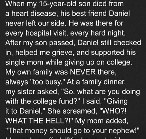 Determined to honor that wish, Scott announced at a family dinner that he planned to give Ben’s $25,000 college fund to Daniel. His relatives exploded in outrage, insisting the money should stay “in the family” and go to one of Ben’s cousins instead.