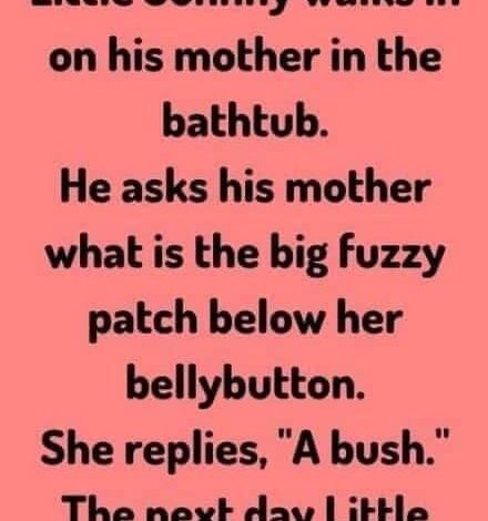 “Mom,” he asked innocently, “what’s that fuzzy patch below your belly button?” Caught off guard but staying calm, she gently replied, “That’s called a bush, sweetheart.”The next day, Johnny once again walked in unannounced—this time while his father was taking a shower. Something else caught his attention, and he just had to ask.