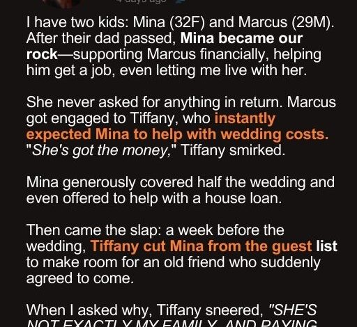 After their dad’s passing, my daughter Mina (32F) supported her brother Marcus (29M) financially and emotionally, even letting me live with her. Marcus’s fiancée, Tiffany, expected Mina to fund their wedding. Mina paid half and offered a house loan, but Tiffany uninvited her to accommodate a friend. Hurt, Mina calmly left, saying, “If my money isn’t welcome, neither am I.”