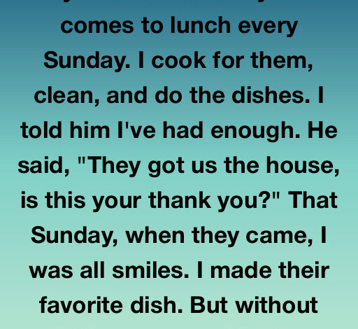 Every Sunday, my husband’s family of eight came for lunch. I cooked, cleaned, and washed dishes, but I was exhausted. I told my husband I’d had enough. He argued they helped us get our house. That Sunday, I made just enough food for them, none for me. They were surprised when the food ran out, and I calmly explained I wasn’t hungry. The room grew awkward.