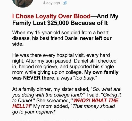 When my 15-year-old son died from heart disease, his best friend Daniel was our rock—always there during hospital visits and grief, unlike my family, who were “too busy.” At a family dinner, I announced I’d give my son’s $25,000 college fund to Daniel. My sister exploded, demanding it go to her son. I challenged them to prove they supported my son in his final months. Silence.